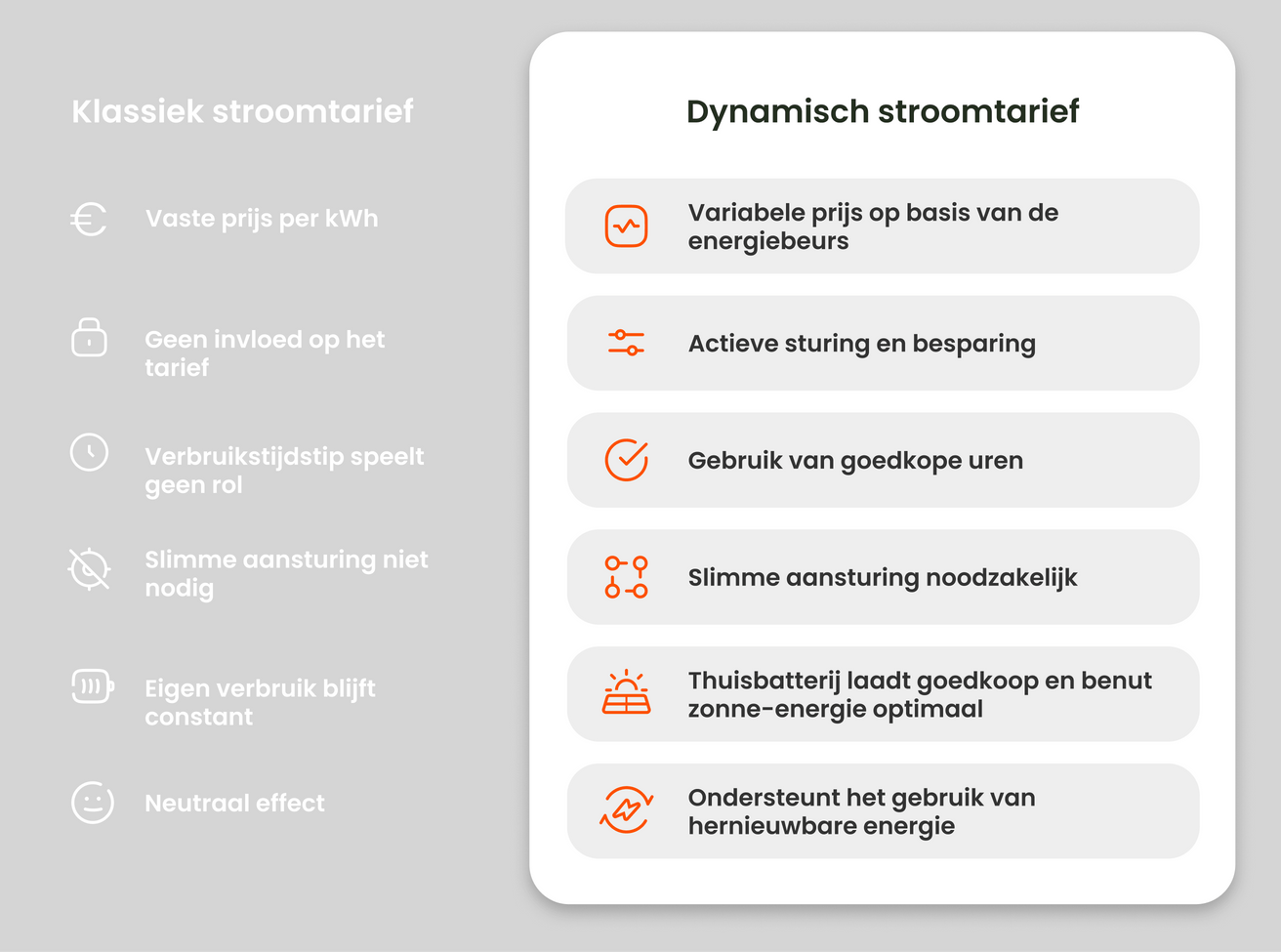 Een dynamisch stroomtarief biedt meer inzicht en besparingsmogelijkheden dan standaard of minder flexibele tarieven. Omdat de prijs elk uur kan veranderen volgens de markt, kun je je verbruik verschuiven naar goedkopere momenten en zo je energiekosten verlagen. Minder flexibele tarieven hebben vaak vaste of grofverdeelde prijsperiodes, waardoor besparingen beperkt zijn, maar ze zijn eenvoudiger in gebruik.